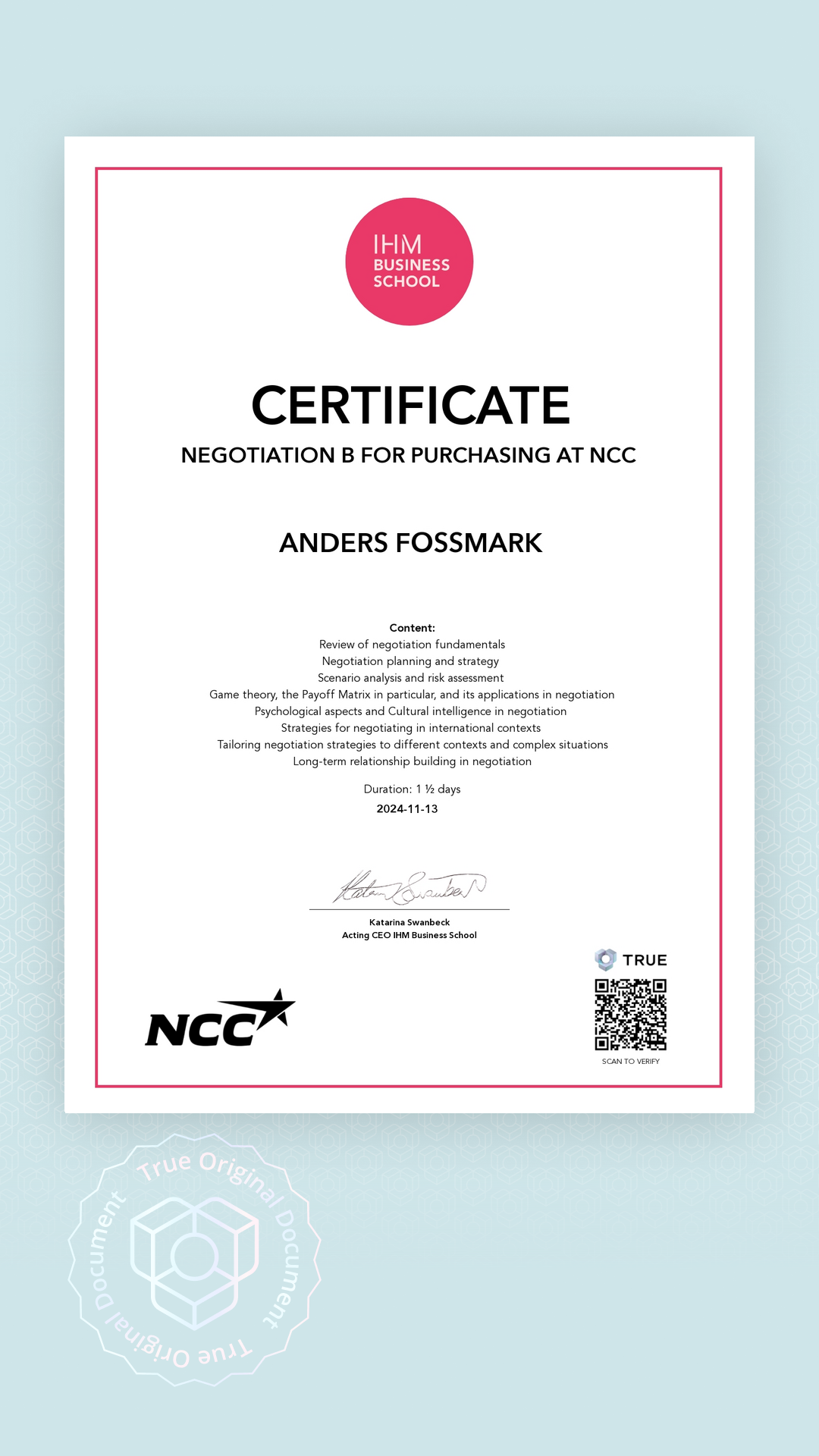 Alla TRUE -document är säkrade med blockchain-teknologi och kan verifieras som äkta. Klicka på verifieringsknappen bredvid dokumentet eller skanna QR-koden med din smartphones kamera. Ingen app krävs - dokumentets äkthet verifieras omedelbart.