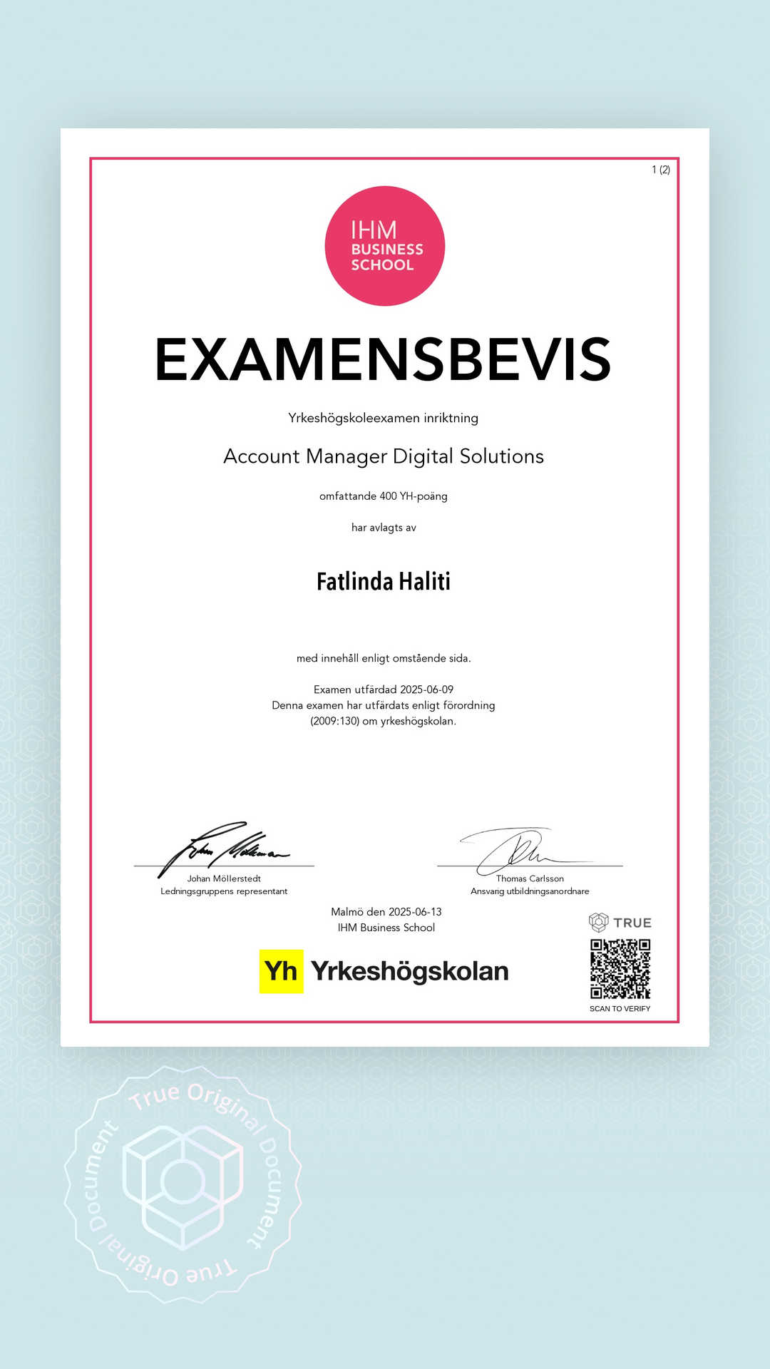 Stort grattis Fatlinda, du kan nu titulera dig som en IHM alumn. Du är nu en del av ett av Sveriges starkaste affärsnätverk - tillsammans med över 60 000 personer ute i näringslivet. Ett sätt att enkelt knyta kontakt med IHM:s nätverk, men även att visa upp din kompetens är att lägga till IHM Business School och din utbildning på ditt CV och din LinkedIn-profil.