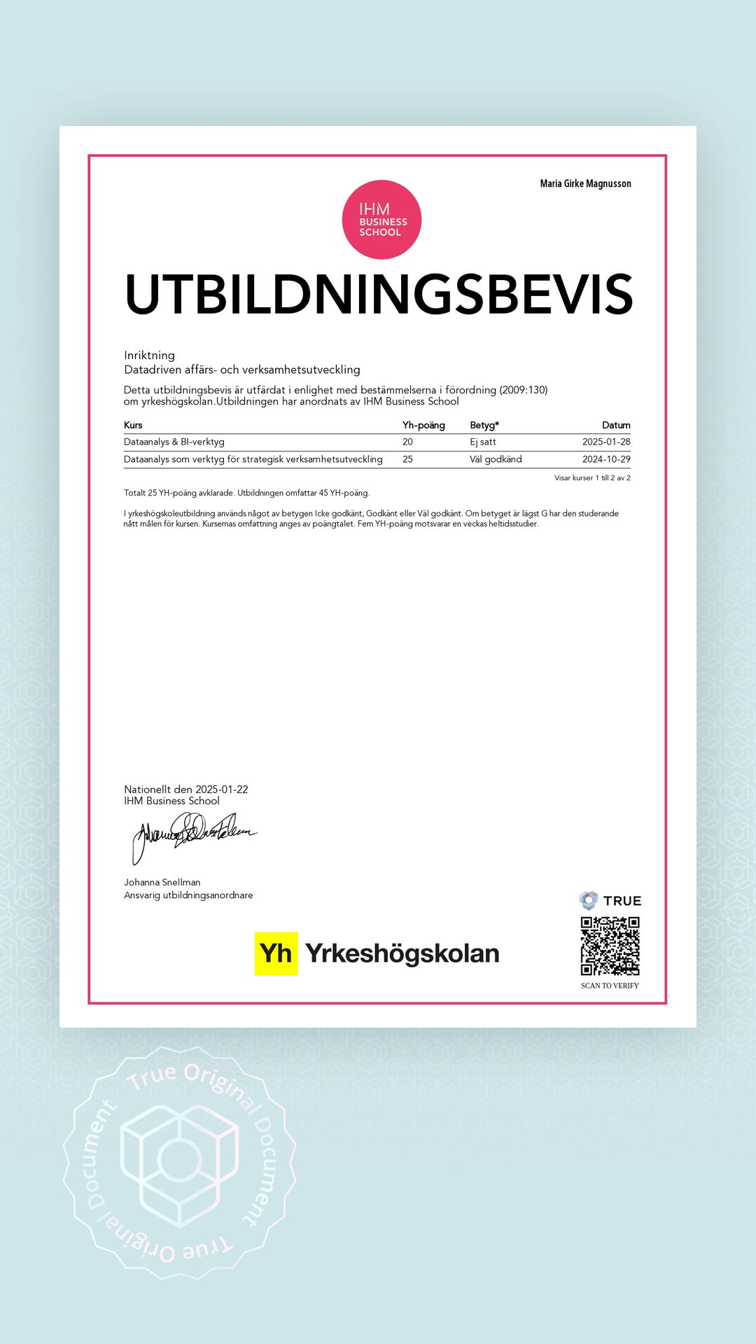 TRUE -dokument är perfekta för studenter eftersom de enkelt kan delas på LinkedIn och i digitala CV:n. Studenterna får verifierbara diplom och certifikat som arbetsgivare kan lita på, vilket ökar deras anställningsbarhet och synlighet på arbetsmarknaden.